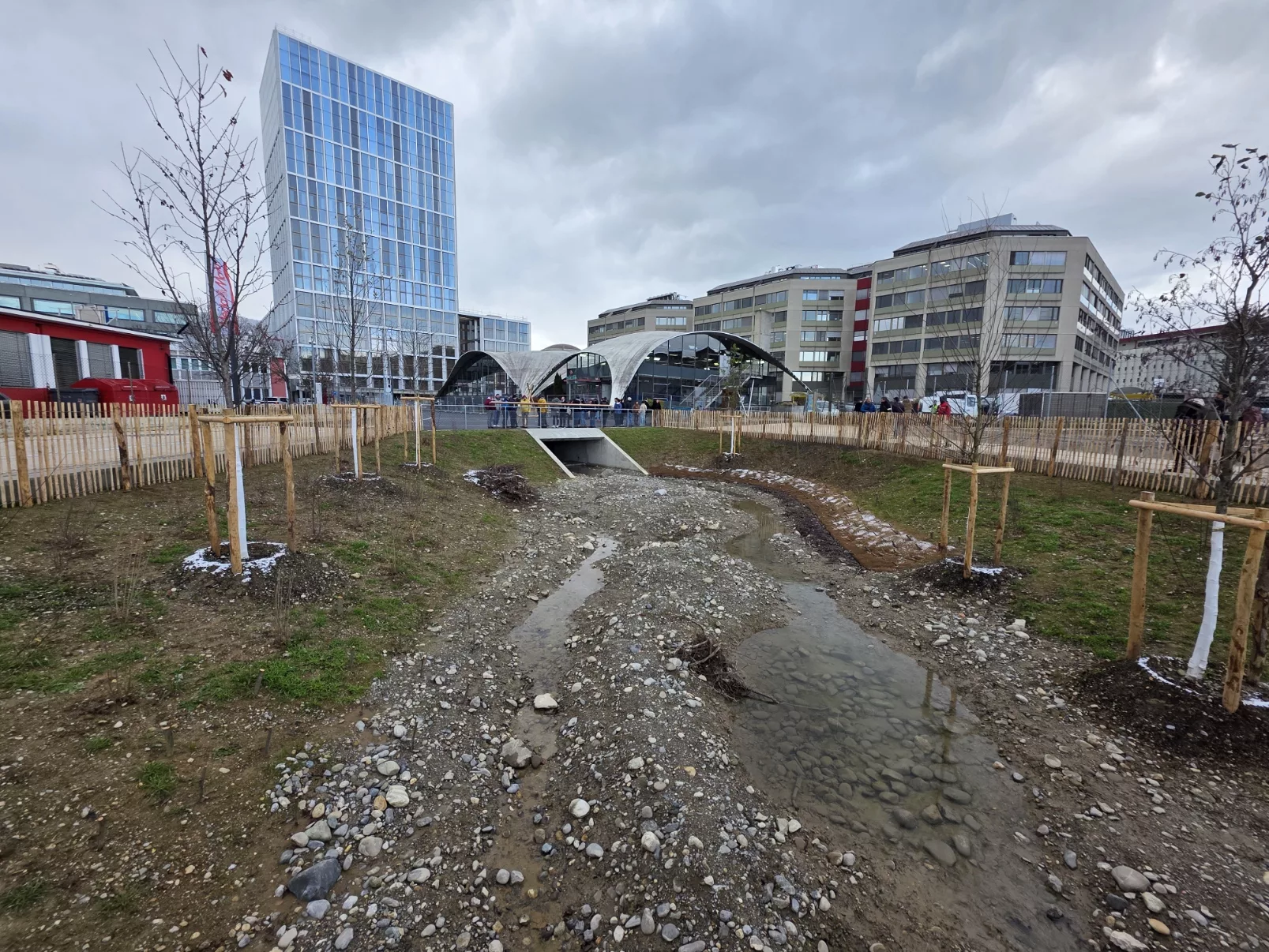 🌊 Une étape historique franchie ! Le mardi 25 novembre, nous avons assisté à la mise en eau du premier tronçon de 450 mètres de la Drize remise à ciel ouvert. Un moment fort qui marque le début de la transformation de ce quartier genevois.